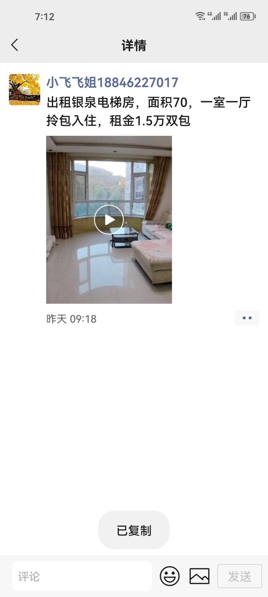 出租银泉电梯房,面积70,一室一厅拎包入住,租金1.5万双包