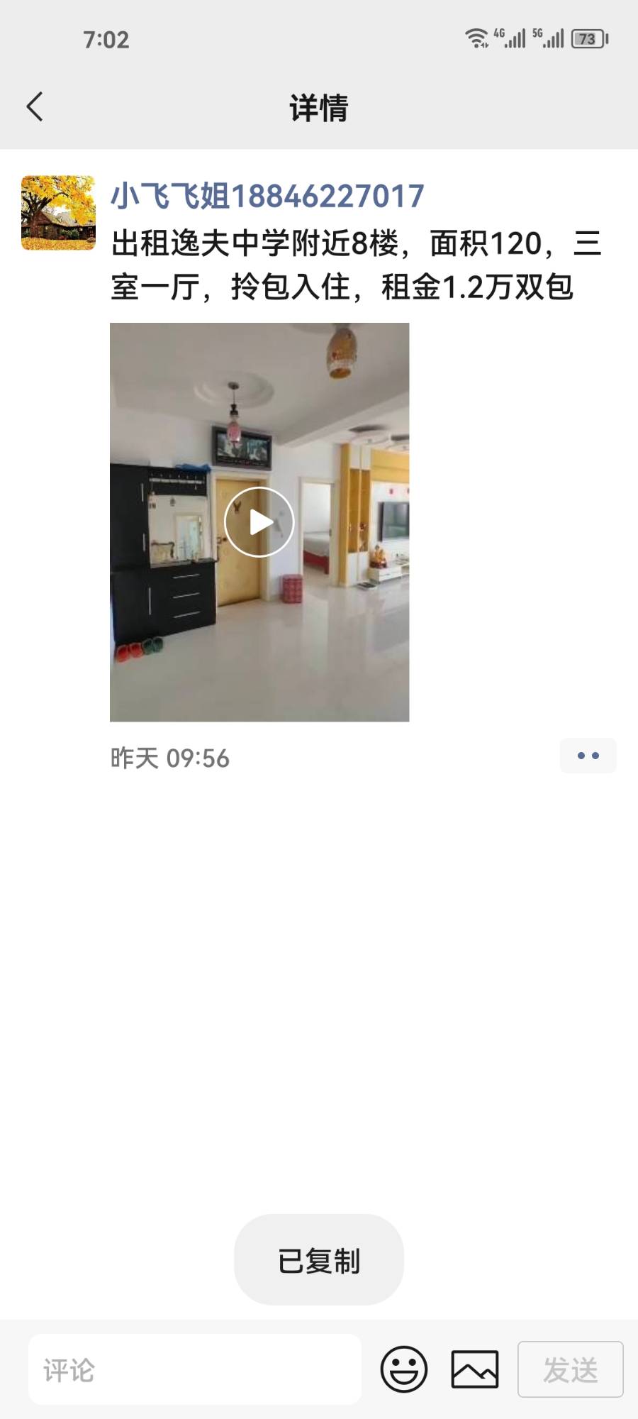出租逸夫中学附近8楼,面积120,三室一厅,拎包入住,租金1.2万双包(微信18846227017)