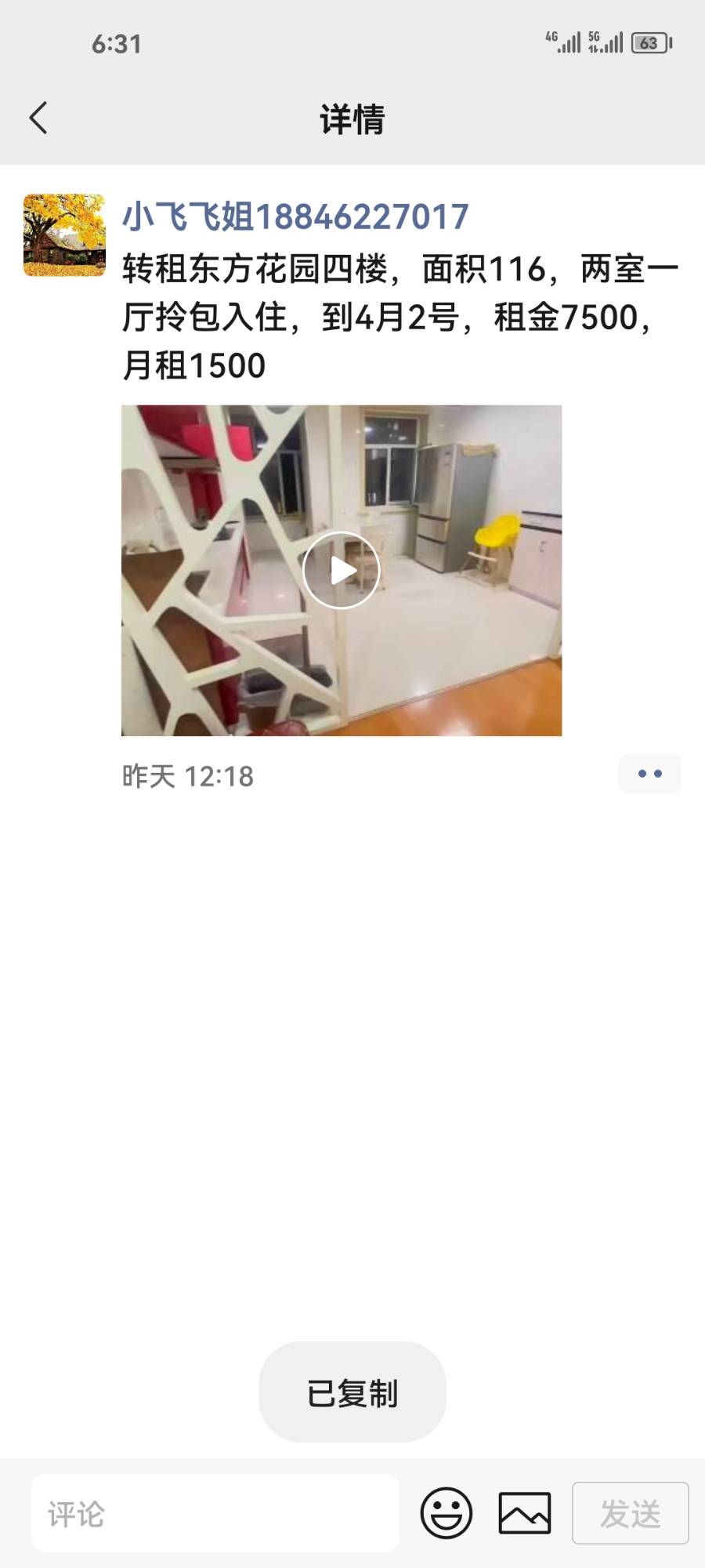 转租东方花园四楼,面积116,两室一厅拎包入住,到4月2号,租金7500,月租1500(微信18846227017)