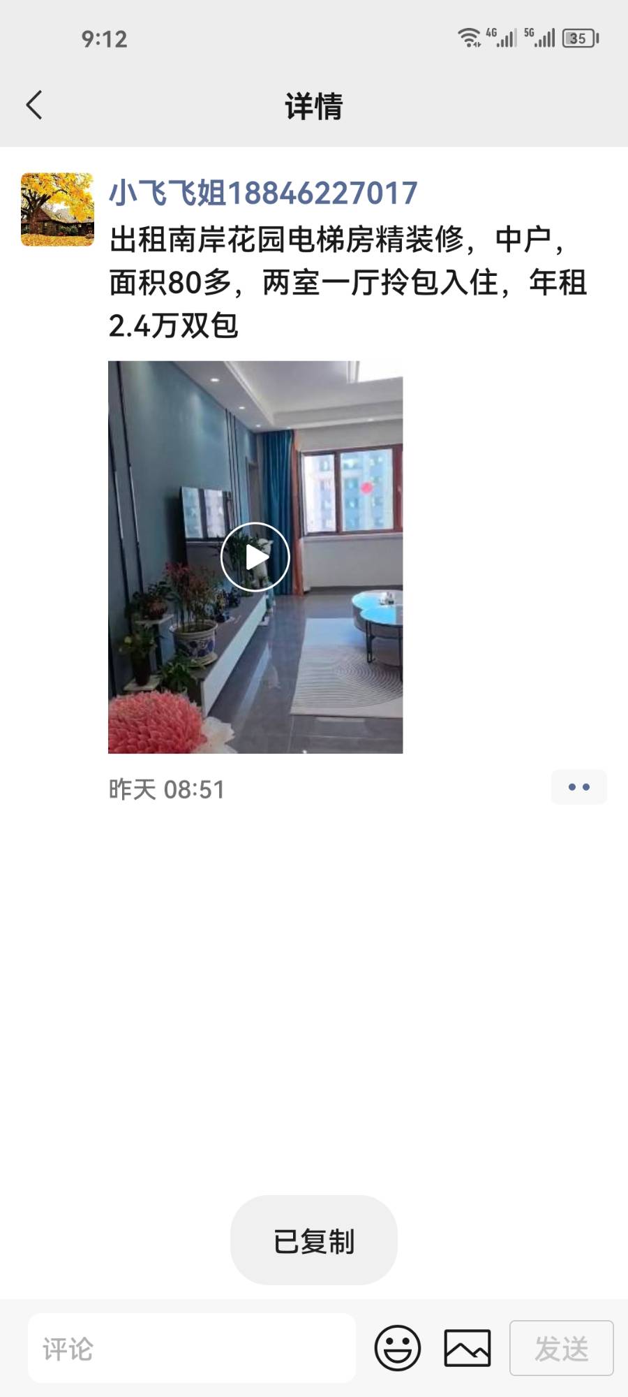 出租南岸花园电梯房精装修,中户,面积80多,两室一厅拎包入住,年租2.4万双包