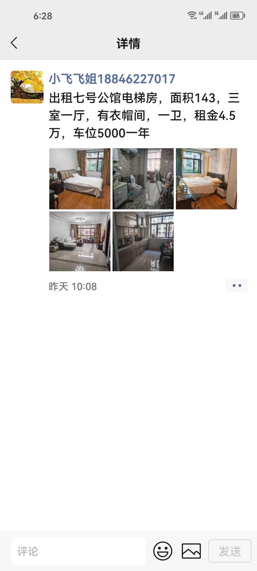 出租七号公馆电梯房,面积143,三室一厅,有衣帽间,一卫,租金4.5万,车位5000一年