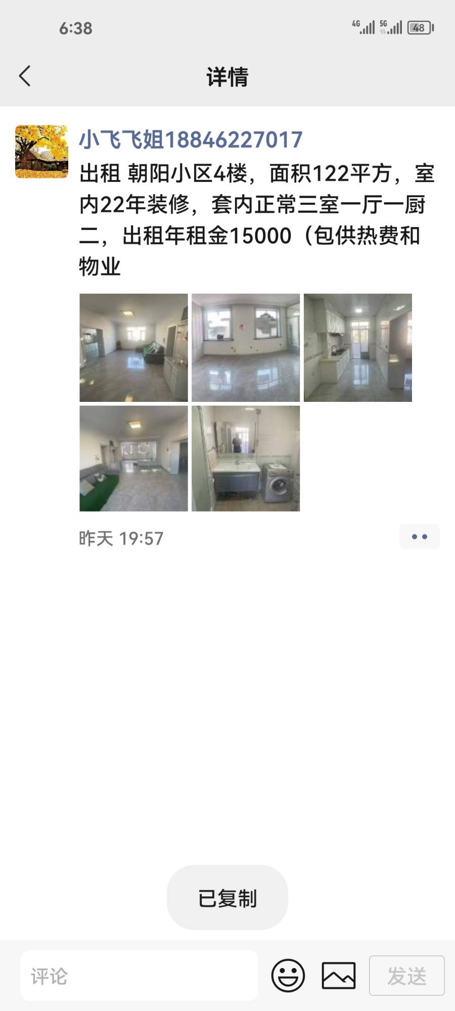出租朝阳小区4楼,面积122平方,室内22年装修,套内正常三室一厅一厨二,出租年租金15000(包供热费和物业
